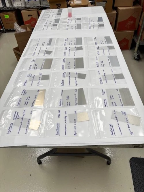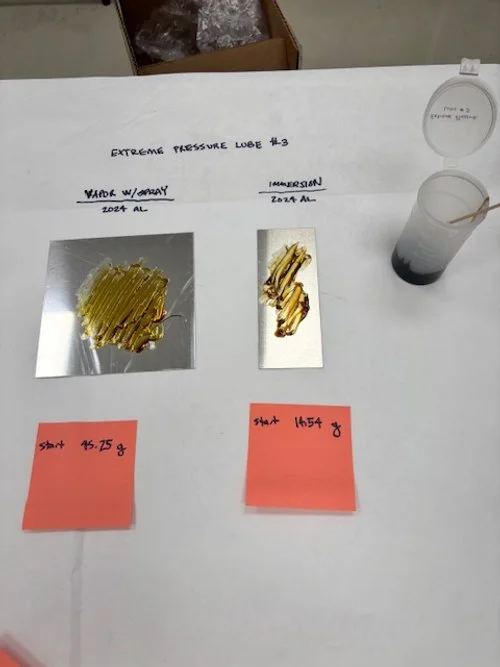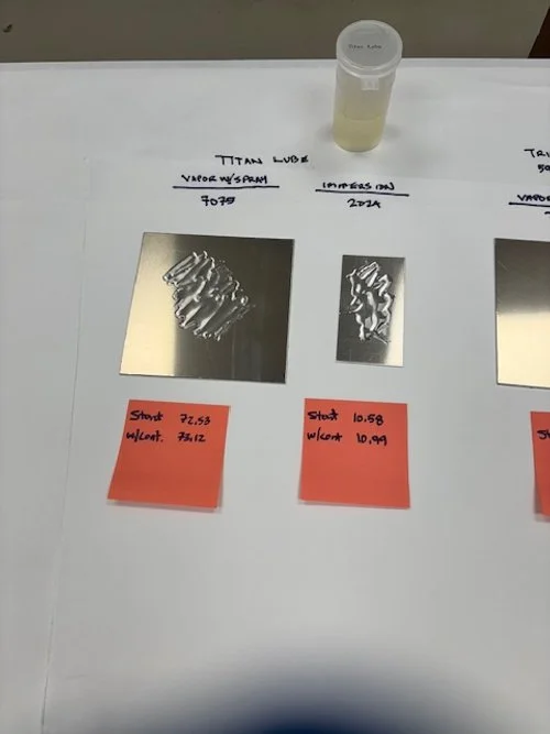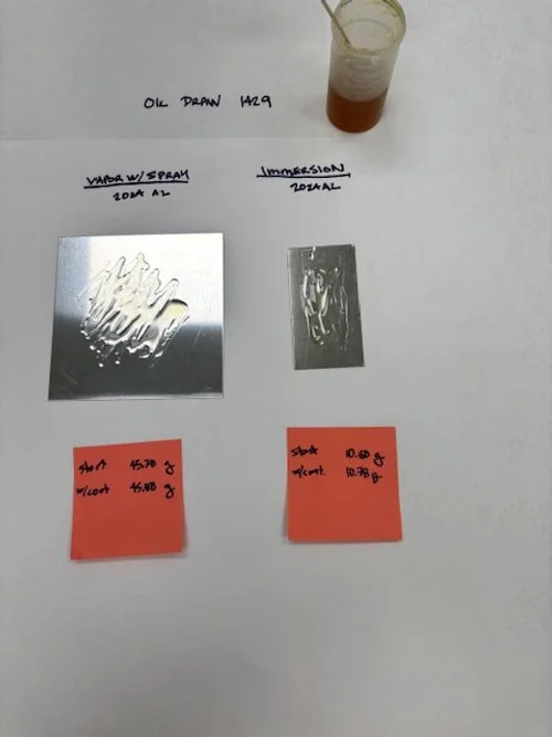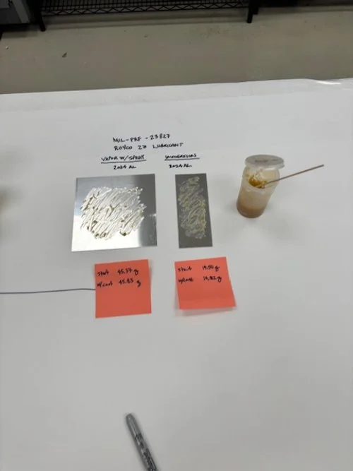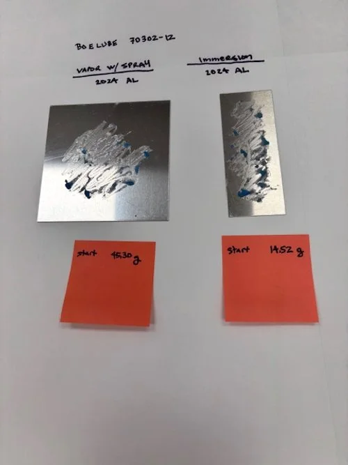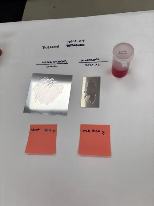 Reliance Specialty Products was approached by a large Aerospace company to help validate if the AeroTron-AV-5408 solvent would effectively remove/clean a variety of contaminants (lubricants, grease, oils) that are used in their manufacturing process. The Aerospace client currently uses an nPB solvent in their vapor degreasers. As part of the validation testing to ensure meeting the cleaning specifications, the company asked Reliance to clean coupons covered in a variety of contaminants.