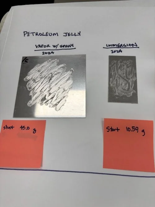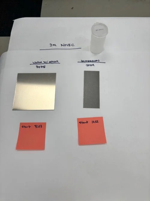 As the reader may note, this validation study is extensive in that care was to be taken to ensure the coupons were prepared properly (a.k.a no contaminant on coupon prior to cleaning), weighed, contaminant applied, and then removed with 2 different cleaning processes (to assess if vapor and spray is sufficient to remove contaminant or if additional immersion is needed). The parts were weighed again, and carefully bagged. Each bag marked with the results of the cleaning & corresponding weights).
