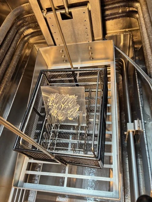 Parts were handled with Nitrile gloves and were in a part rack fixture in a slightly off vertical posture. Each part was cleaned separately.